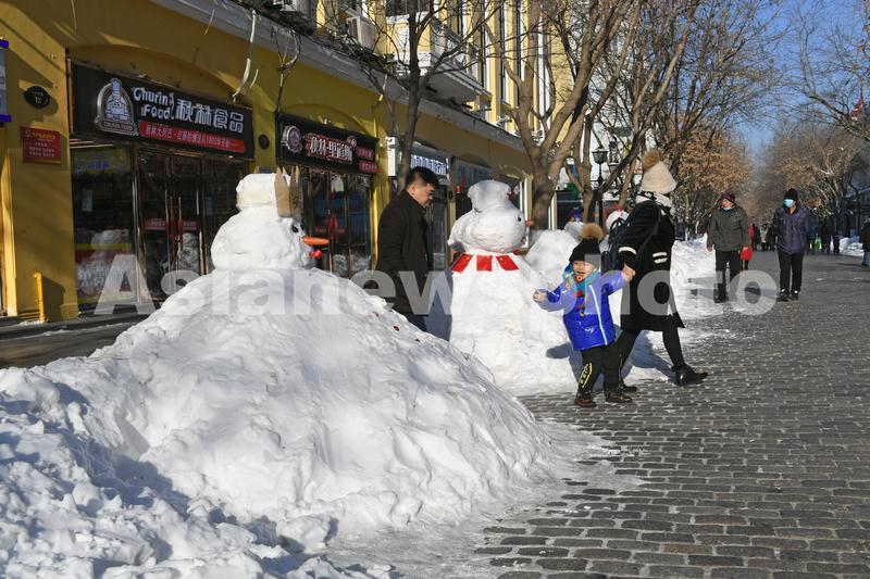图片说明:11月22日,在哈尔滨百年老街中央大街上,积雪被堆成各式各样的雪人。