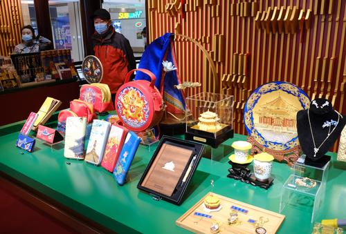 2020年11月24日,辽宁沈阳,游客在“盛京宫赏”沈阳故宫文创体验店参观选购文创产品。