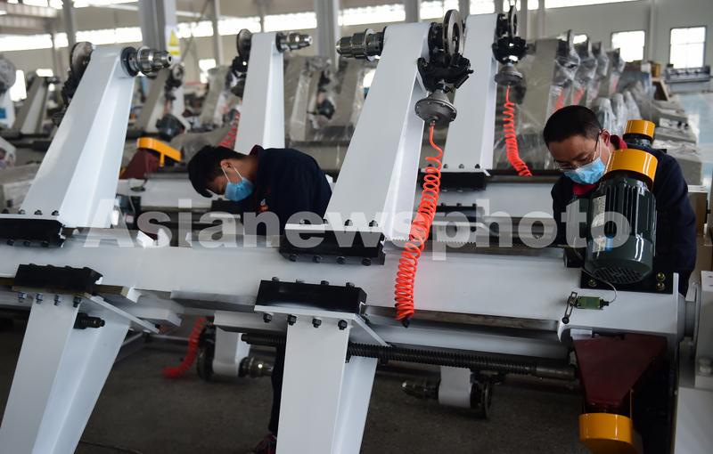 图片说明:11月26日,河北省东光县一家纸箱设备公司,工人在为国外客户生产包装机械。