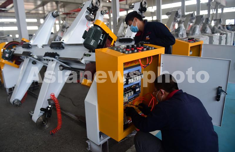 图片说明:11月26日,河北省东光县一家纸箱设备公司,工人在为国外客户生产包装机械。