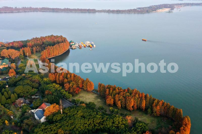 2020年12月4日,时值冬日,武汉东湖景区仍浸透在色彩斑斓的秋色之中,不少市民和游客趁着晴好的天气前来游览。