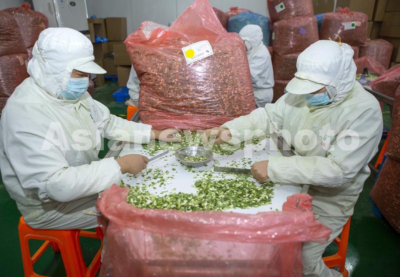 2020年12月10日,在江苏省兴化市垛田街道王横村,农民在加工脱水香葱,赶制出口订单产品。