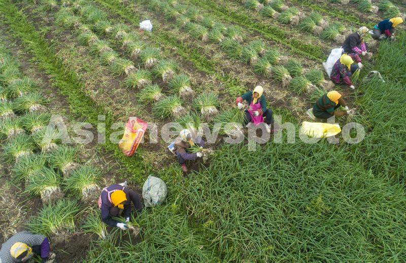 2020年12月10日,在位于江苏省兴化市垛田街道王横村的种植基地,农民在收获香葱(无人机照片)。