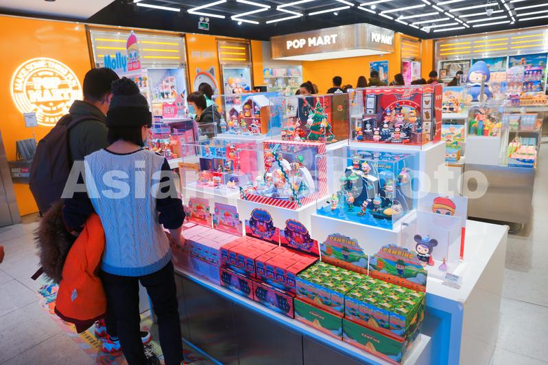 图片说明:2020年12月5日,上海,喜爱创意玩具产品的顾客粉丝在网红潮玩盲盒品牌泡泡玛特线下旗舰店内购物消费。