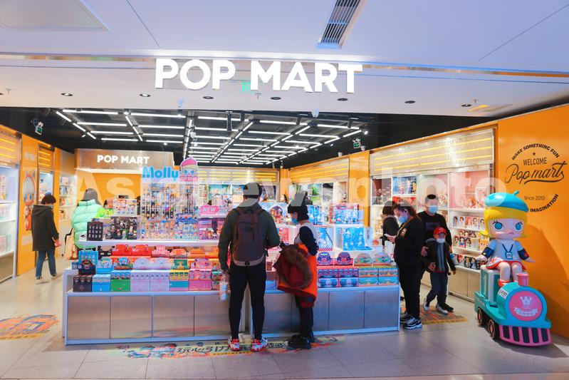 图片说明:2020年12月5日,上海,喜爱创意玩具产品的顾客粉丝在网红潮玩盲盒品牌泡泡玛特线下旗舰店内购物消费。