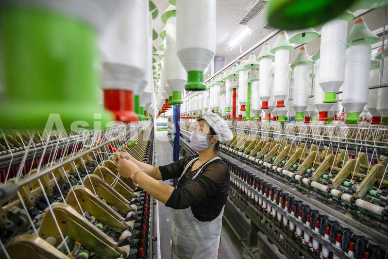 图片说明:2020年12月14日,位于江苏省海安市墩头镇的南通苏中纺织有限公司车间内,工人们正在生产线上忙碌。