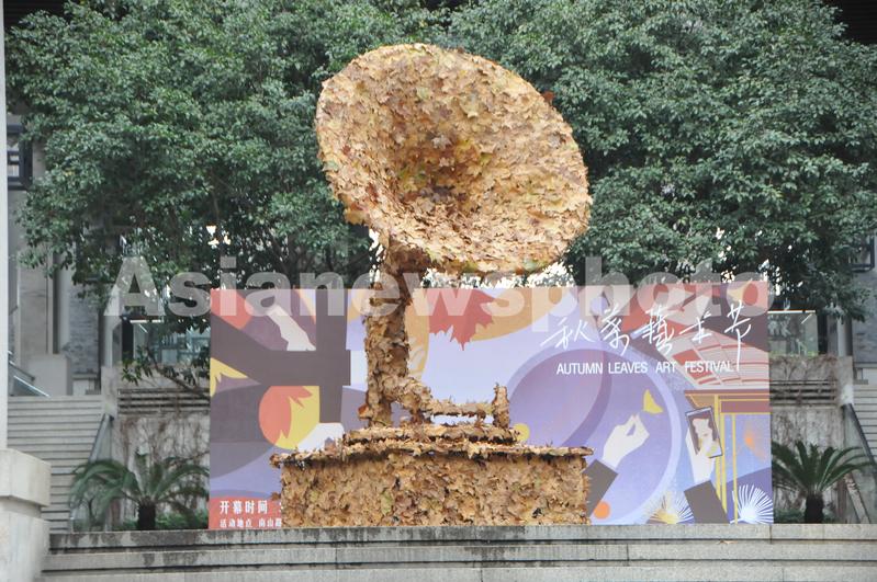 图片说明:12月14日,中国美术学院“秋叶艺术节”上展示的梧桐落叶雕塑《国美留声机》。
