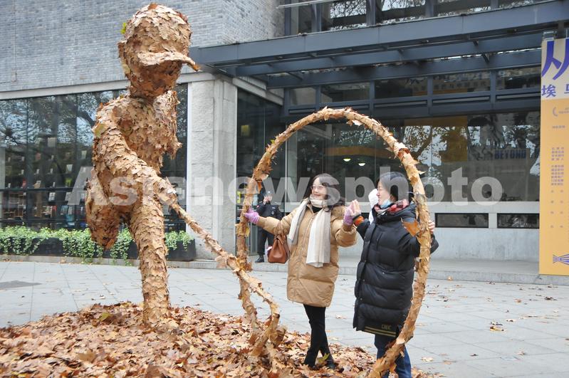 图片说明:12月14日,中国美术学院“秋叶艺术节”上展示的梧桐落叶雕塑《滚动世界》。