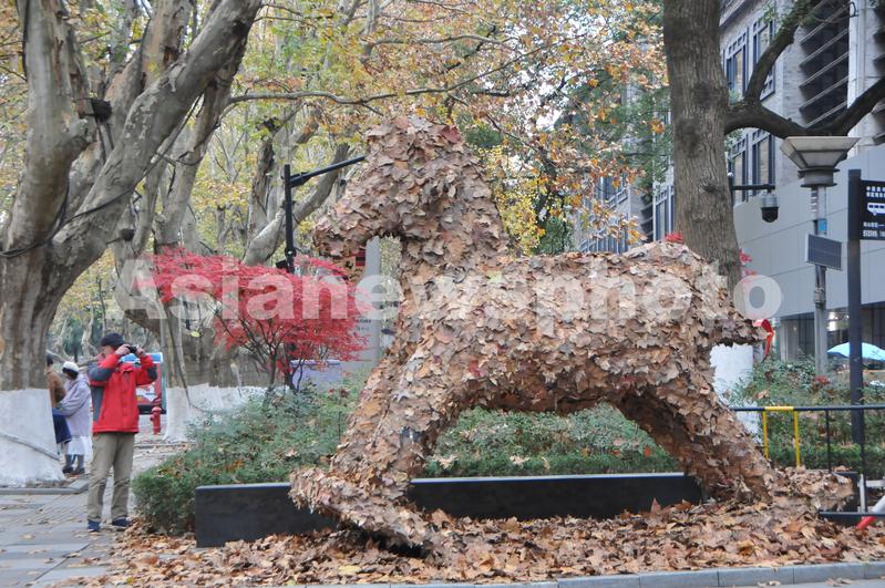 图片说明:12月14日,中国美术学院“秋叶艺术节”上展示的梧桐落叶雕塑《时光木马》。