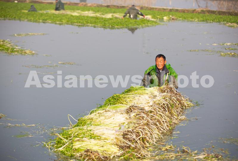 2020年12月22日,江苏省海安市墩头镇长垎村5组水芹菜种植基地内,菜农在采收水芹菜。入冬以来,当地种植的水芹菜大量上市,菜农菜农忙着采收、整理、清洗、包装水芹菜,供应本地及周边市场。