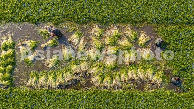 2020年12月22日,江苏省海安市墩头镇长垎村5组水芹菜种植基地内,菜农在采收水芹菜。入冬以来,当地种植的水芹菜大量上市,菜农菜农忙着采收、整理、清洗、包装水芹菜,供应本地及周边市场。