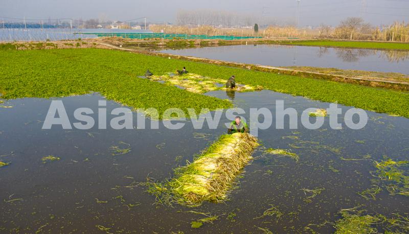 2020年12月22日,江苏省海安市墩头镇长垎村5组水芹菜种植基地内,菜农在采收水芹菜。