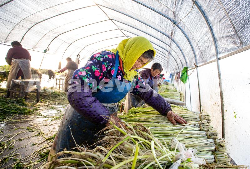 2020年12月22日,江苏省海安市墩头镇长垎村5组水芹菜种植基地内,菜农在采收水芹菜。入冬以来,当地种植的水芹菜大量上市,菜农菜农忙着采收、整理、清洗、包装水芹菜,供应本地及周边市场。