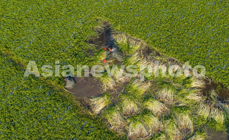 2020年12月22日,江苏省海安市墩头镇长垎村5组水芹菜种植基地内,菜农在采收水芹菜。入冬以来,当地种植的水芹菜大量上市,菜农菜农忙着采收、整理、清洗、包装水芹菜,供应本地及周边市场。