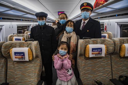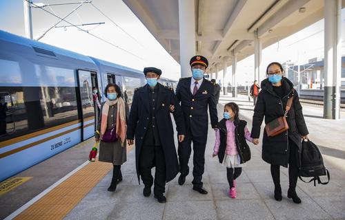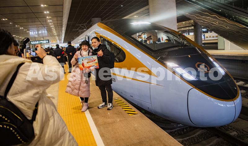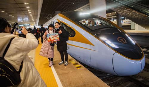 图片说明:西安北站,市民在银西高铁“复兴号”动车组前合影留念。