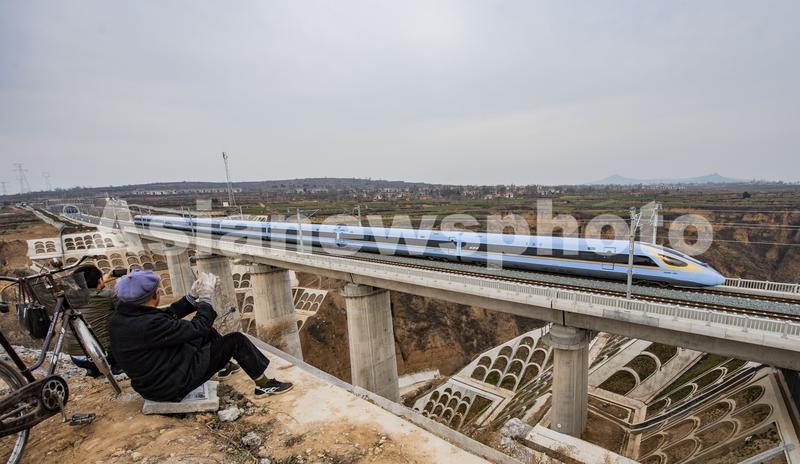 图片说明:陕西省咸阳市乾县城关街道,78岁的王家壕村村民孙志民专程骑车到两公里外大桥村附近的山崖上,看急驰而过的银西高铁“复兴号”动车组。孙志民说,自己以前骑自行车要10小时才能到西安,如今坐“复兴号”动车组半个小时就能到。