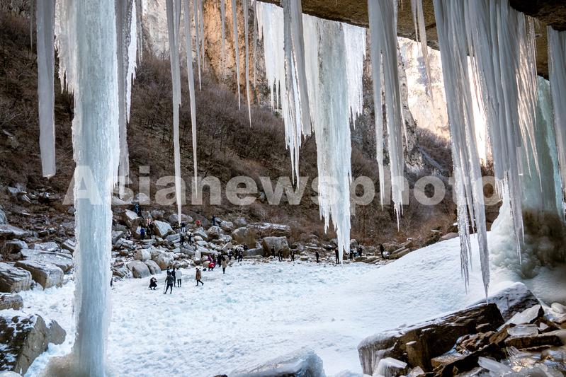 图片说明:2020年12月25日,河南省林州市太行大峡谷内的巨型冰瀑景观吸引游人。
