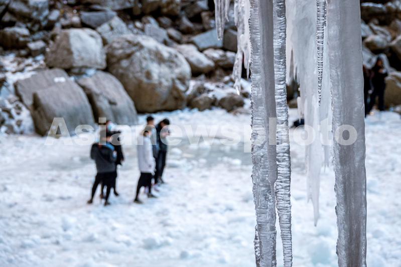 图片说明:2020年12月25日,河南省林州市太行大峡谷内的巨型冰瀑景观吸引游人。
