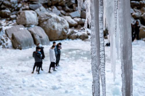 河南林州:黑龙潭140米高冰瀑吸引游人 查看组图