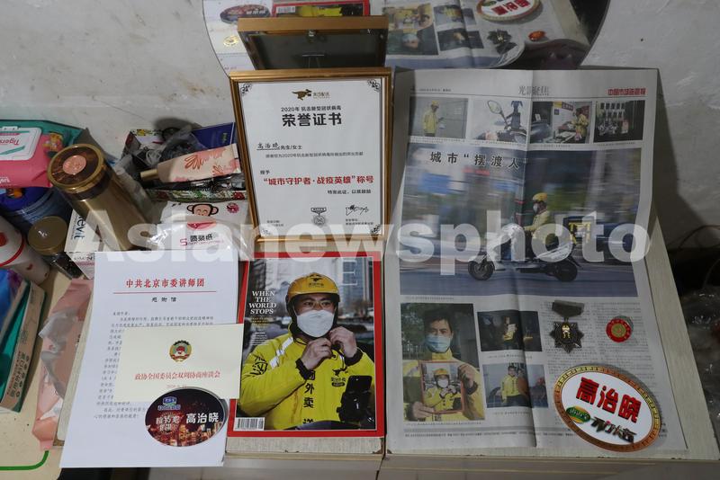 这是高治晓的各种“藏家宝”,里边有各大报刊杂志对他的报道,美团公司授予他的荣誉证书、勋章,还有上电视节目戴的名牌。对于被《时代周刊》选为抗疫群像之一这件事,高治晓认为自己是“幸运的”。