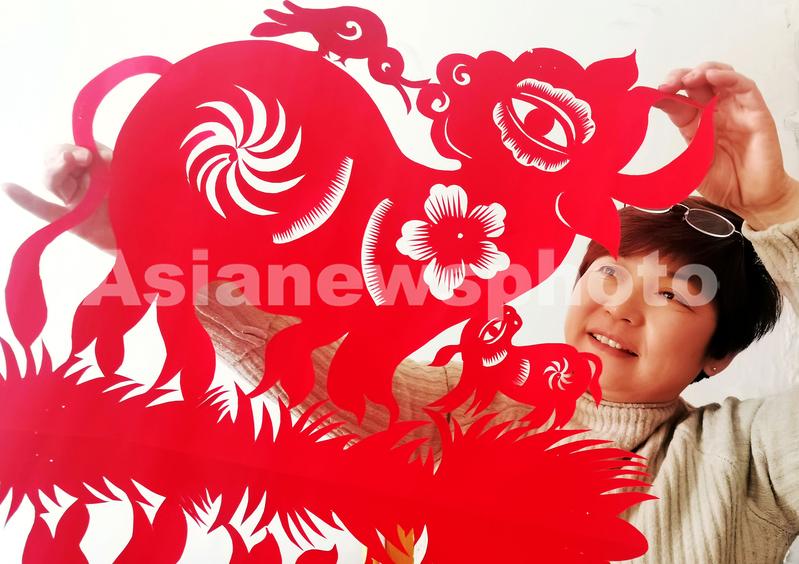 图片说明:2021年1月7日,在安徽省亳州市谯城区文化馆亳州剪纸传习所,一位民间剪纸艺术家正在展示自己创作的剪纸作品《春牛》。