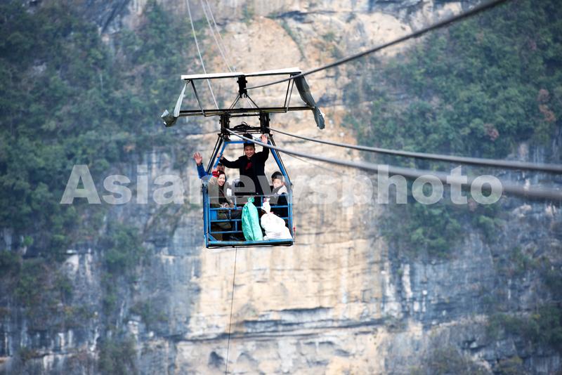 图片说明:当地群众乘坐溜索上的铁栅栏(单次可乘坐6人)进出小山村。