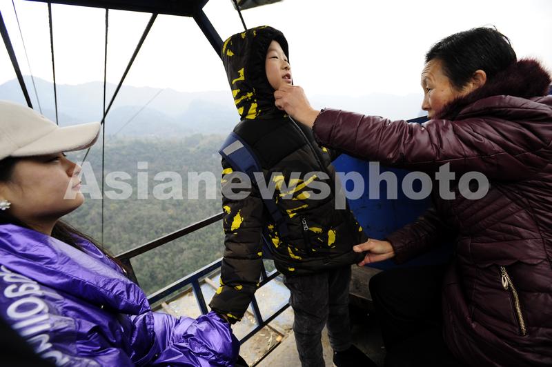 图片说明:当地群众乘坐溜索上的铁栅栏(单次可乘坐6人)进出小山村。