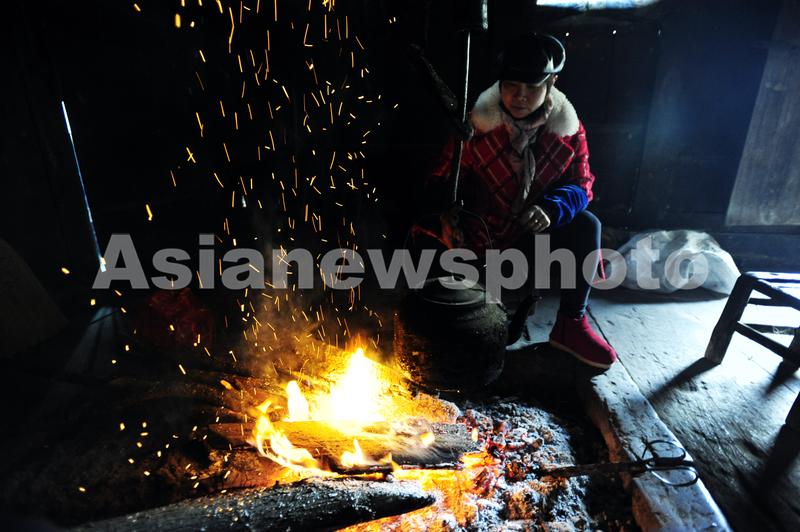 图片说明:渔山村妇女在家里生火取暖、熏制腊肉。