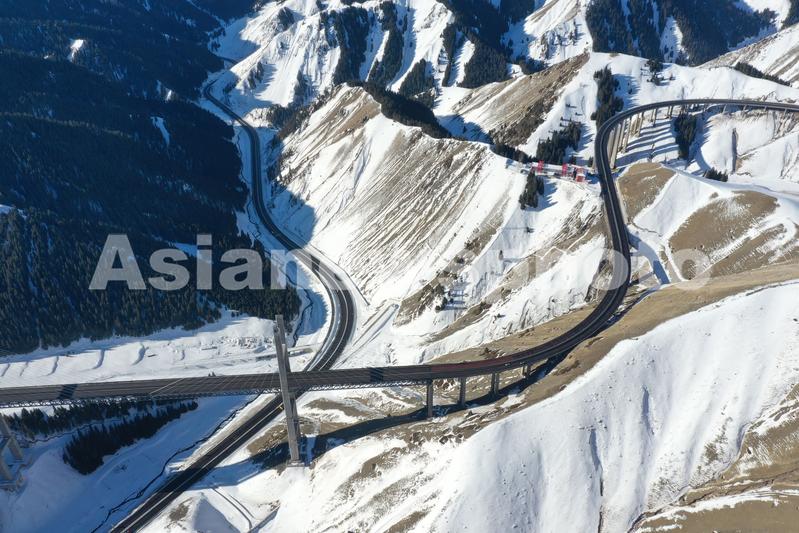2021年1月17日,无人机航拍新疆伊犁霍城县果子沟大桥。