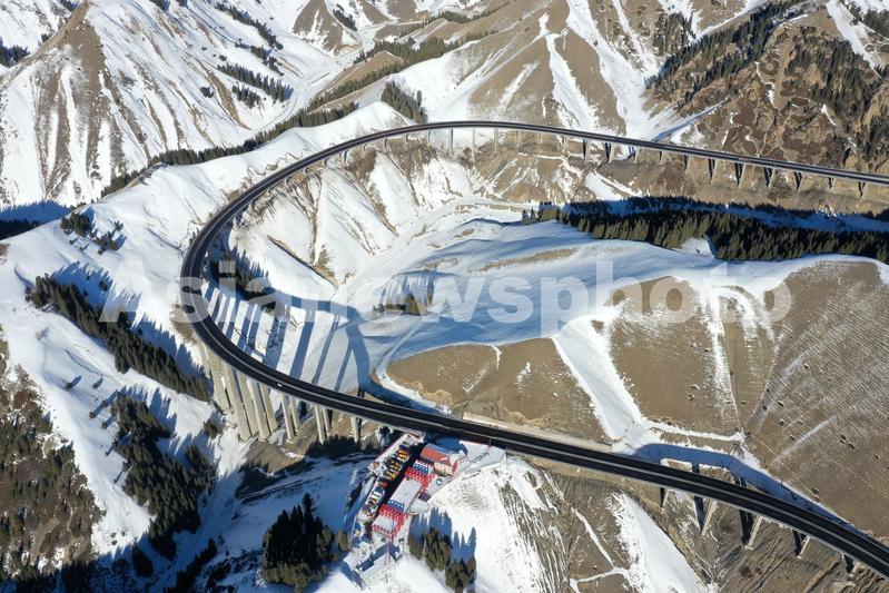 2021年1月17日,无人机航拍新疆伊犁霍城县果子沟大桥。