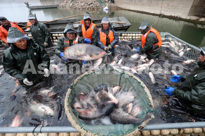 图片说明:1月21日,在安徽省全椒县黄栗树水库,工人将捕到的鱼投入吊篮中。