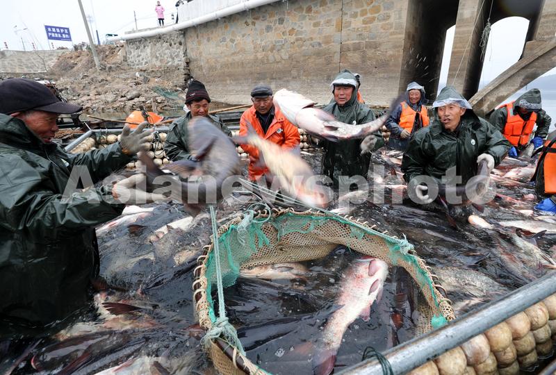 图片说明:1月21日,在安徽省全椒县黄栗树水库,工人将捕到的鱼投入吊篮中。