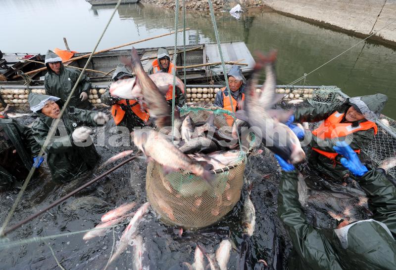 图片说明:1月21日,在安徽省全椒县黄栗树水库,工人将捕到的鱼投入吊篮中。