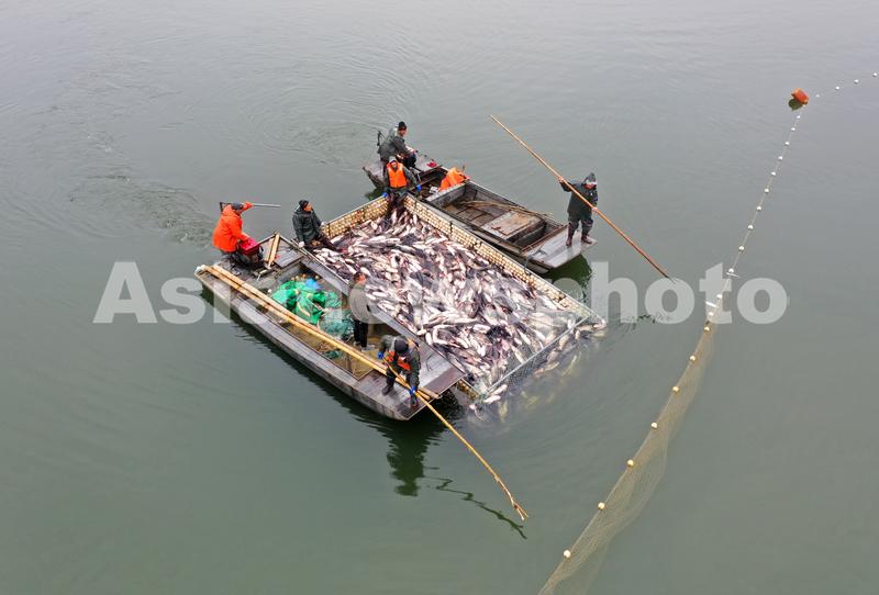 图片说明:1月21日,在安徽省全椒县黄栗树水库,工人用网箱将鱼运往岸边。