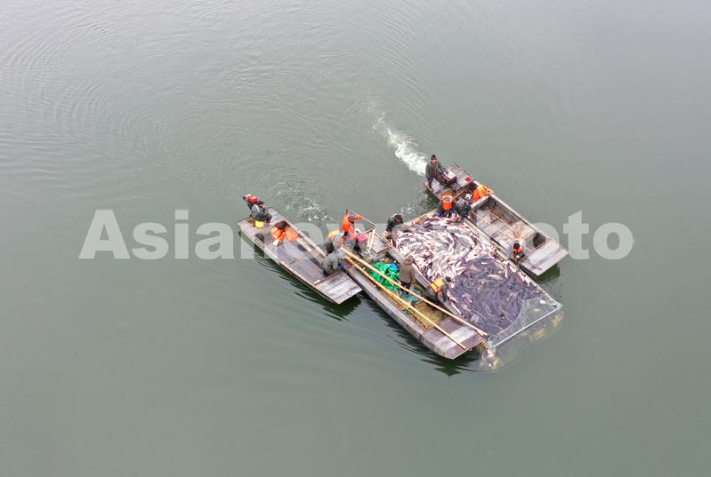 图片说明:1月21日,在安徽省全椒县黄栗树水库,工人用网箱将鱼运往岸边。