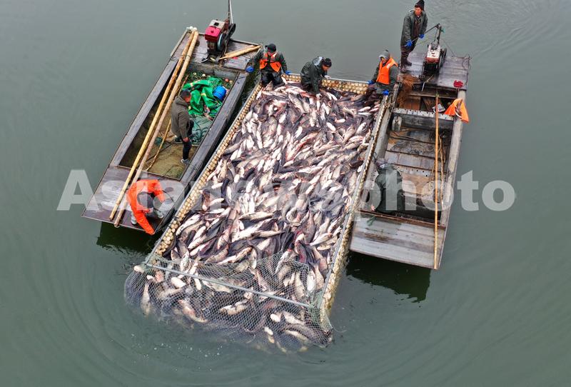 图片说明:1月21日,在安徽省全椒县黄栗树水库,工人用网箱将鱼运往岸边。