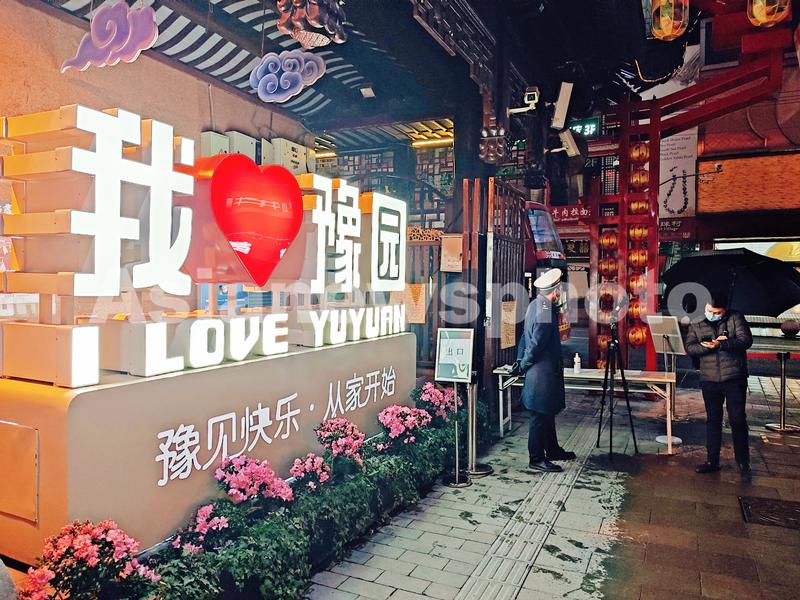 2021年1月25日,上海豫园商城,为防控新冠疫情对进入老城厢园区游客进行严格健康码和体温审核。