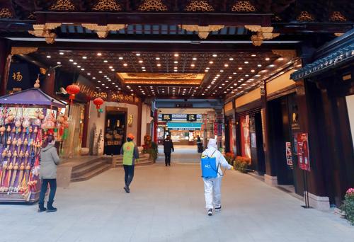 2021年1月25日,上海,申城人气消费旅游地标豫园商城为营造安全环境展开大规模消毒防疫,同时对进入老城厢园区游客进行严格健康码和体温审核,因为黄浦区出现了多处疫情风险地区,商城内各个网红购物及小吃餐饮店相对比较冷清,景区内的城隍庙已于近期关闭,但是豫园传统民俗艺术灯会仍然会在春节前夕正常举办。