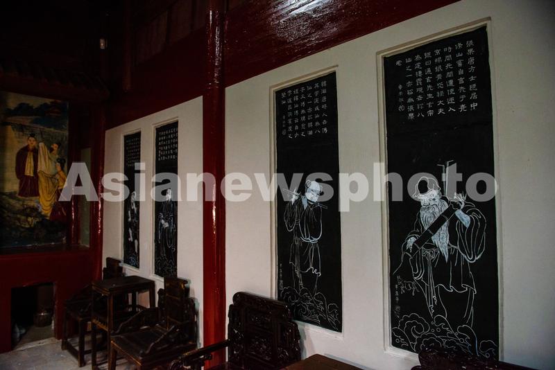 图片说明:2021年1月31日,湖北鄂州,在观音阁一楼老君殿两侧墙壁上拍摄到的八仙石刻塑像。