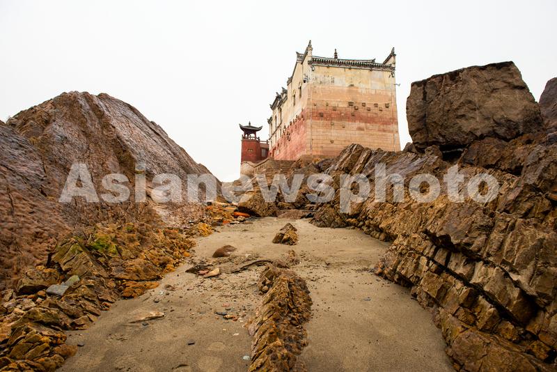 图片说明:2021年1月31日,湖北鄂州,洪峰退后,观音阁矗立在裸露的巨大礁石上。