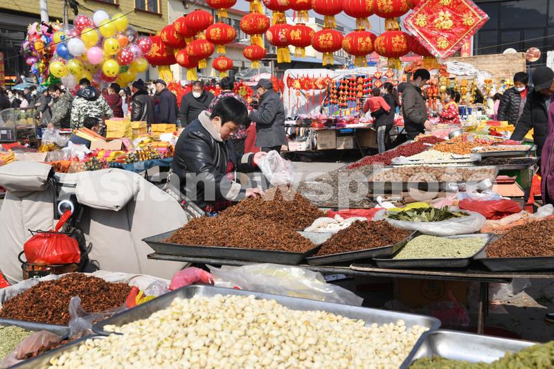 2021年1月31日,人们在山东枣庄山亭大集选购食品。