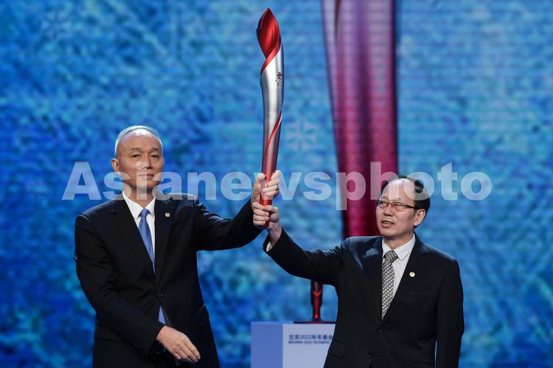图片说明:北京市委书记、北京冬奥组委主席蔡奇(左)在北京冬奥会火炬发布现场。
