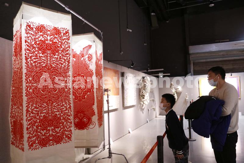 图片说明:2021年2月6日,在位于北京的中国科学技术馆举办的中国手工造纸的技·艺主题展上,家长与孩子被展出的剪纸作品所吸引。