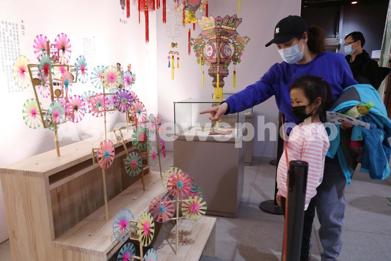 图片说明:2021年2月6日,在位于北京的中国科学技术馆举办的中国手工造纸的技·艺主题展上,家长与孩子在观赏展出的风车。