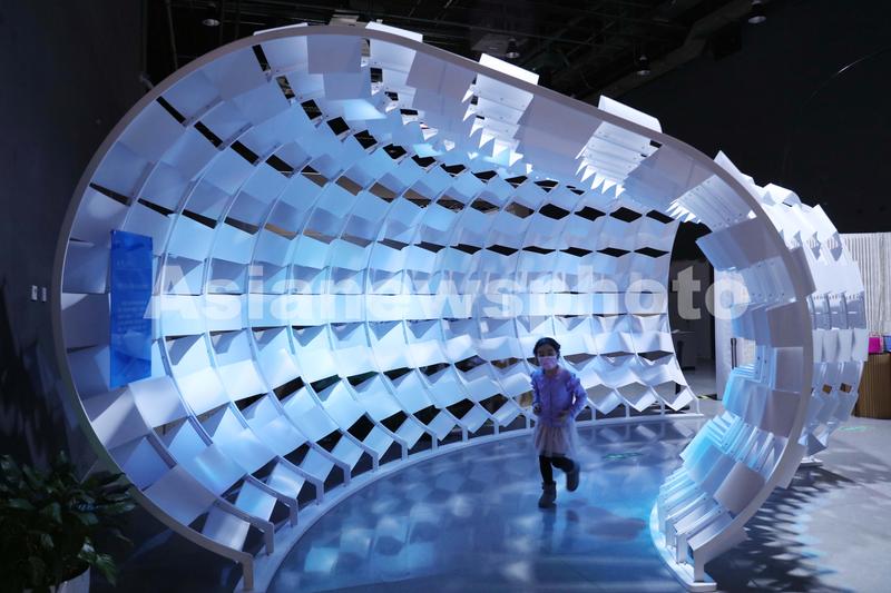 图片说明:2021年2月6日,在位于北京的中国科学技术馆举办的中国手工造纸的技·艺主题展上,一名儿童在折纸搭建的“隧道”里奔跑。
