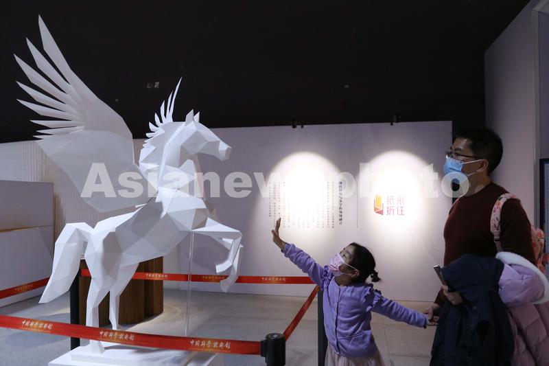 图片说明:2021年2月6日,在位于北京的中国科学技术馆举办的中国手工造纸的技·艺主题展上,家长与孩子观看展出的纸艺作品“骏马”。