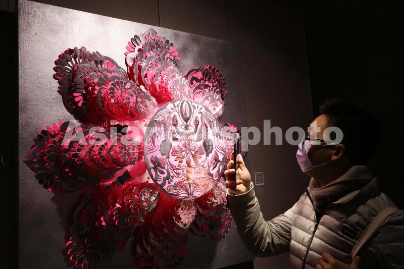 图片说明:2021年2月6日,在位于北京的中国科学技术馆举办的中国手工造纸的技·艺主题展上,观众用手机拍摄纸艺作品“无限之花”。