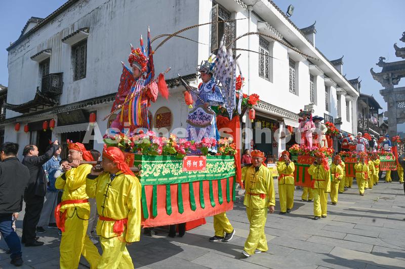 图片说明:2021年2月15日,农历正月初四,江西省婺源县江湾镇农民举行极富传统农耕文化特色的“豆腐架”民俗表演,庆新春佳节。