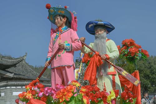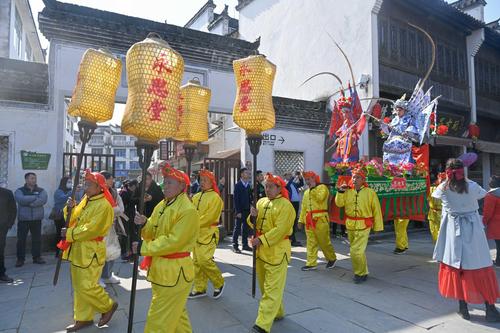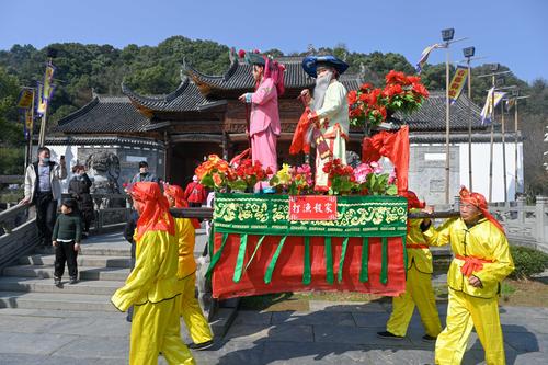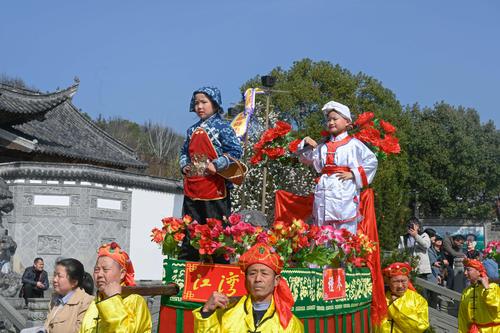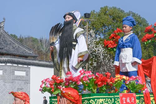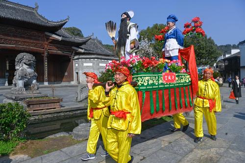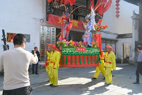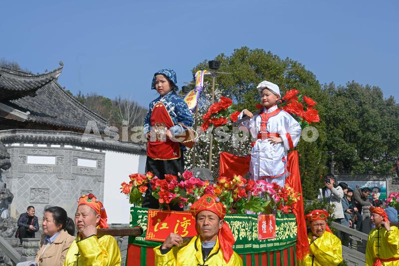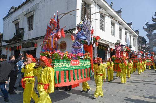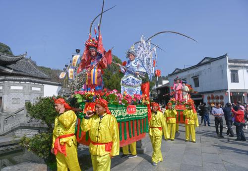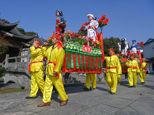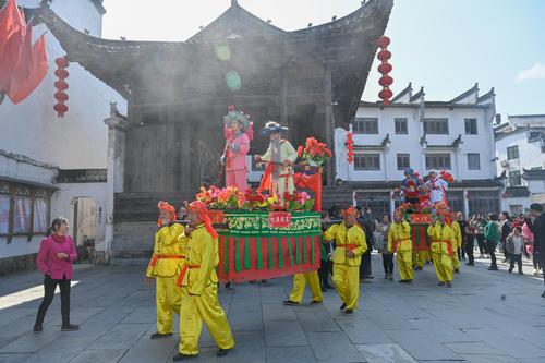 图片说明:2021年2月15日,农历正月初四,江西省婺源县江湾镇农民举行极富传统农耕文化特色的“豆腐架”民俗表演,庆新春佳节。