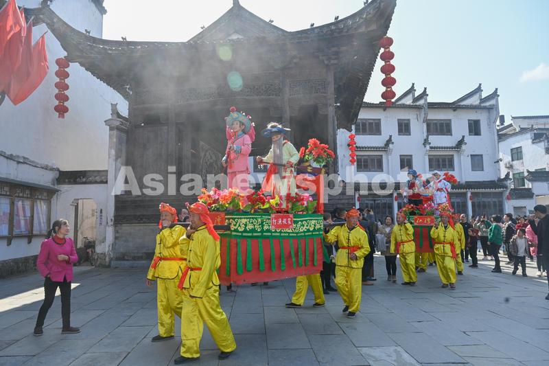 图片说明:2021年2月15日,农历正月初四,江西省婺源县江湾镇农民举行极富传统农耕文化特色的“豆腐架”民俗表演,庆新春佳节。